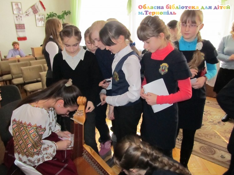 Коли дзвенять бандури, змовкають навіть солов’ї… І це насправді так. В своєму звучанні бандура здатна передати найтонші людські емоції та почуття. Героїчний епос, щирі духовні пісні, проникливий спів – були і є шанованими не лише на Україні, а й за її межами. Чарівні звуки бандури лунали і в нашій бібліотеці. 28 лютого у відділі мистецтв відбувся літературно-мистецький вечір «Під срібні переливи бандури», на який були запрошені студенти II та IV курсів народного відділу музичного училища ім. С. Крушельницької. У їхньому виконанні прозвучали українські пісні та думи, класичні музичні твори. Юні бандуристи показали справжню майстерність, адже «…на бандурі грає той, хто по-справжньому її любить».